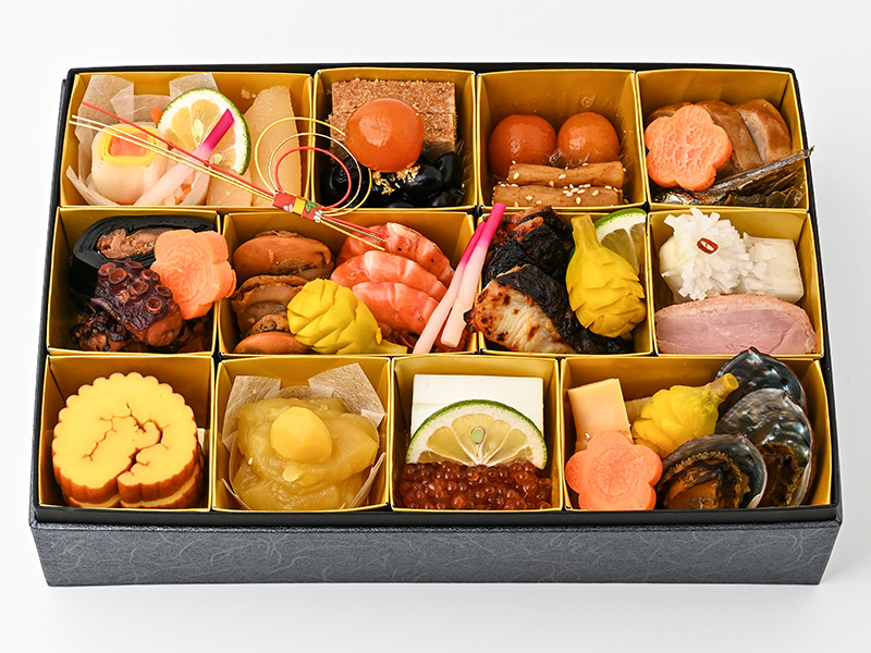 数の子、サーモン紅白巻き、イクラ、黒豆、松風、紅白なます、金柑、たたき牛蒡、田作り、鶏牛蒡巻き、蛸柔らか煮、鰤昆布巻き、海老艶煮、帆立旨煮、鰤西京焼き、慈姑蜜煮、合鴨ロース焼き、菊蕪、伊達巻、栗きんとん、柚子蒲鉾、蝦夷鮑煮、穂付き筍、はじかみ