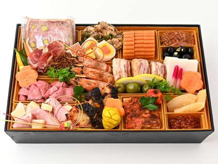 パテドカンパーニュ、南州農場コッパ、ピクルス、国産牛ローストビーフ、酒井赤豚のジャンボンブラン、パルミジャーノレッジャーノ、かなわ水産牡蠣マリネ、オリーブ、天使エビのパンチェッタ巻き、ホタテのパンチェッタ巻き、鰤西京焼き、黒毛和牛のラザニア、イクラ、数の子、山口商店柚子蒲鉾、鴨の低温ロースト、伊達巻、サーモン紅白巻き、黒豆、はじかみ、慈姑蜜煮、イチジクのサラミ